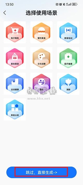 之后用戶需要選擇自己logo要使用的場(chǎng)景,或者點(diǎn)擊下方跳過直接生成。