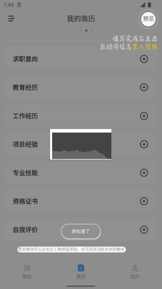 4、將自己的簡(jiǎn)歷編輯完成之后,點(diǎn)擊預(yù)覽查看最終的效果