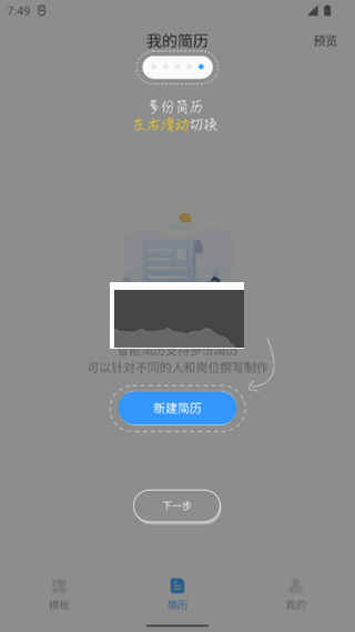 2、切換到【簡(jiǎn)歷】界面,上方的小點(diǎn)能左右滑動(dòng)進(jìn)行多份簡(jiǎn)歷的切換,點(diǎn)擊下方的“新建簡(jiǎn)歷”,就能創(chuàng)建新的電子簡(jiǎn)歷信息