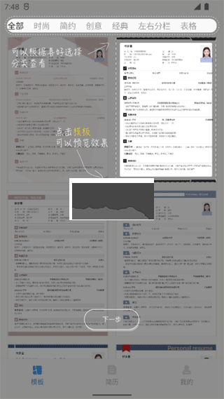 2、可以選擇模板,對(duì)所選模板進(jìn)行排版調(diào)整,幫助你快速調(diào)整簡(jiǎn)歷的布局、字體、間距等。