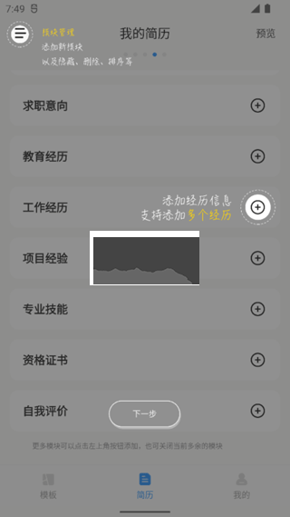 3、進(jìn)入到簡(jiǎn)歷編輯頁(yè)面,點(diǎn)擊左上角的三橫圖標(biāo)能添加新模塊,以及隱藏、刪除、排序等操作,豐富自身的工作經(jīng)歷