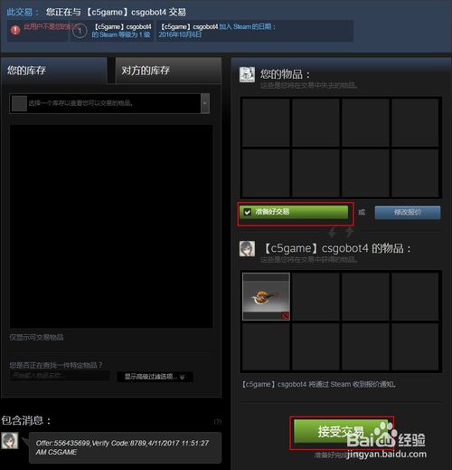 跳轉(zhuǎn)steam交易界面,勾選確認(rèn)交易內(nèi)容。左下方有驗證碼的代表和您進行交易的是C5機器人。
