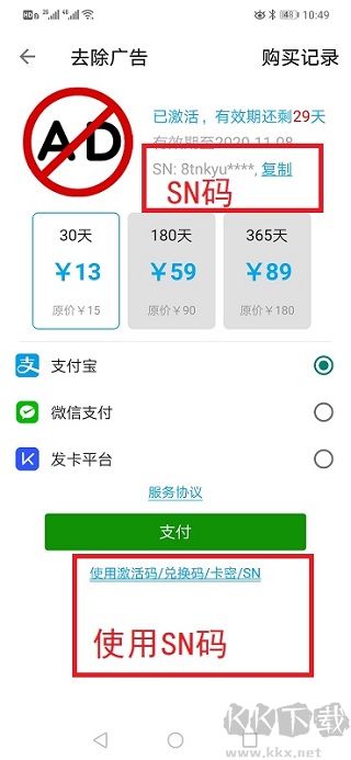 付費,是通過SN碼的方式進(jìn)行激活的(在用微信/支付寶方式購買時),會自動激活。因此,找回丟失的權(quán)限,也就是需要找回這個SN碼。見下圖: