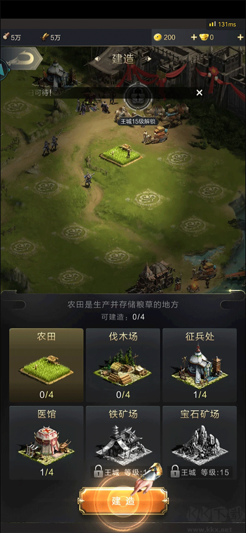 2、城外共有35塊田,根據(jù)自己的游戲理念,主流的資源建筑的建造思路有10伐木、7農(nóng)田、8礦石、6寶石、3醫(yī)館、1征兵。