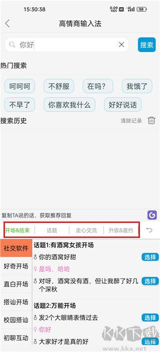 5、如下圖所示,這就是輸入法界面了,除了可以像常規(guī)輸入法那樣使用,還有各種開場語,話題可以便捷選擇。