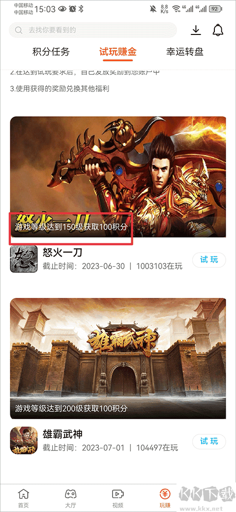3、在玩賺界面中,玩家通過完成積分任務(wù)來獲取積分,同時也可以在試玩賺金界面中領(lǐng)取試玩游戲,在到達試玩要求后平臺會將獎勵發(fā)送至您的賬戶中