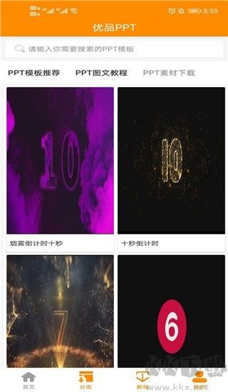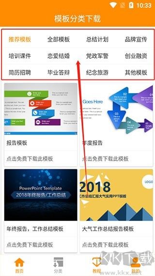 2、在應(yīng)用的首頁中,展示有不同風(fēng)格和不同類型的PPT模板分類