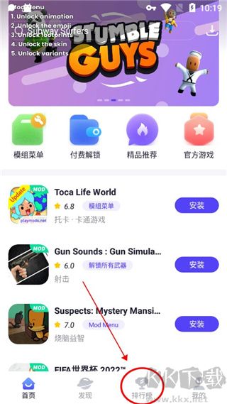 1、首先在kk下載并打開playmods(游戲盒子軟件)應(yīng)用,點(diǎn)擊排行榜;