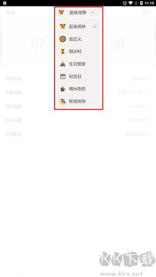 2、點擊頂部中間可以選擇鬧鐘的類型。
