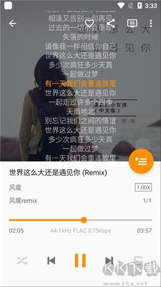 3、播放開始后,該軟件將自動自動下載和顯示專輯封面和藝術(shù)家圖片,包括顯示歌詞 (標(biāo)簽內(nèi)置歌詞或lrc文件);