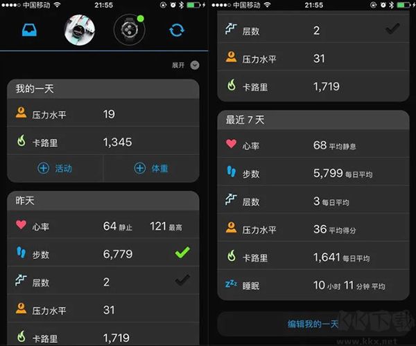 1、手表與手機配對后,運動數(shù)據(jù)會自動上傳至佳速度app,在這個app上可以查閱詳細的運動數(shù)據(jù)。比如,首屏【我的一天】菜單會展示當天、昨天以及最近7天記錄到的身體數(shù)據(jù),包括心率、不輸、爬樓層數(shù)、壓力水平、卡路里、睡眠時間。