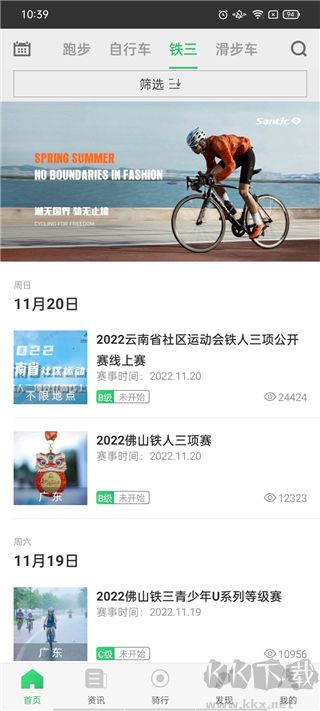 3、進(jìn)入軟件首頁可以看見跑步、自行車、鐵三、滑步車、資訊、騎行、發(fā)現(xiàn)、我的選項。