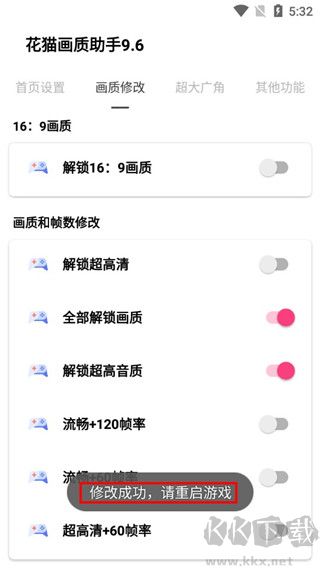 2、點(diǎn)擊畫質(zhì)修改,玩家們可使用解鎖16:9畫質(zhì)、解鎖超高清、全部解鎖畫質(zhì)、解鎖超高音質(zhì)、流暢+120+60幀率、超高清+60幀率等功能;