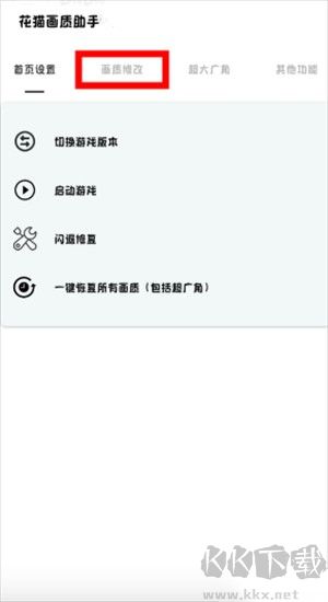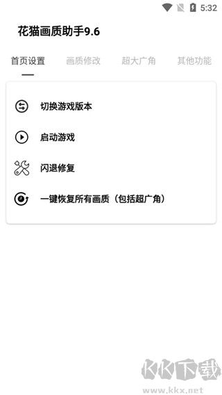 1、在本站下載并安裝花貓畫質(zhì)助手240幀,在軟件的首頁(yè)設(shè)置玩家們可以使用切換游戲版本、啟動(dòng)游戲、閃退修復(fù)、一鍵恢復(fù)所有畫質(zhì)等功能;