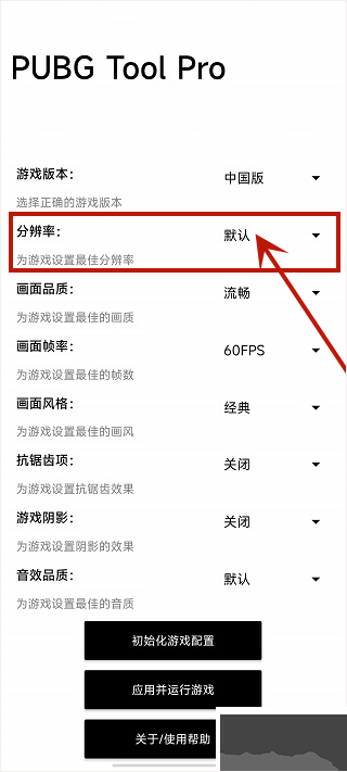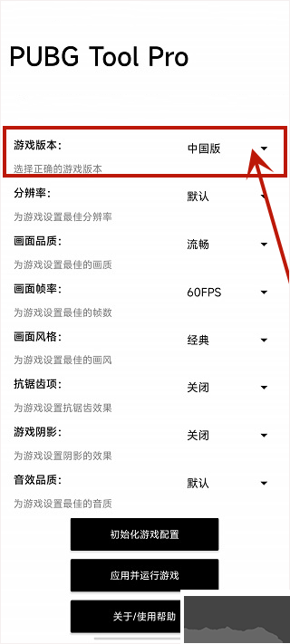 1、下載并安裝成功后打開軟件,首先需要選擇自己游戲的版本,軟件不僅支持和平精英的畫面比例修改,同時(shí)也支持國(guó)際版,按需選擇即可。