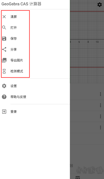 打開GeoGepa計算器套件左上角的菜單,菜單可以:創(chuàng)建新文件、打開現(xiàn)有資源、保存文件、分享資源,以及更改設置、切換計算器、獲取幫助。