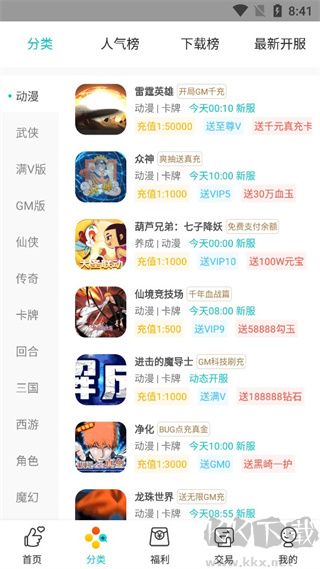 3、點(diǎn)擊分類,這里有很多不同類型的游戲,還有人氣榜單,熱門榜單推薦;