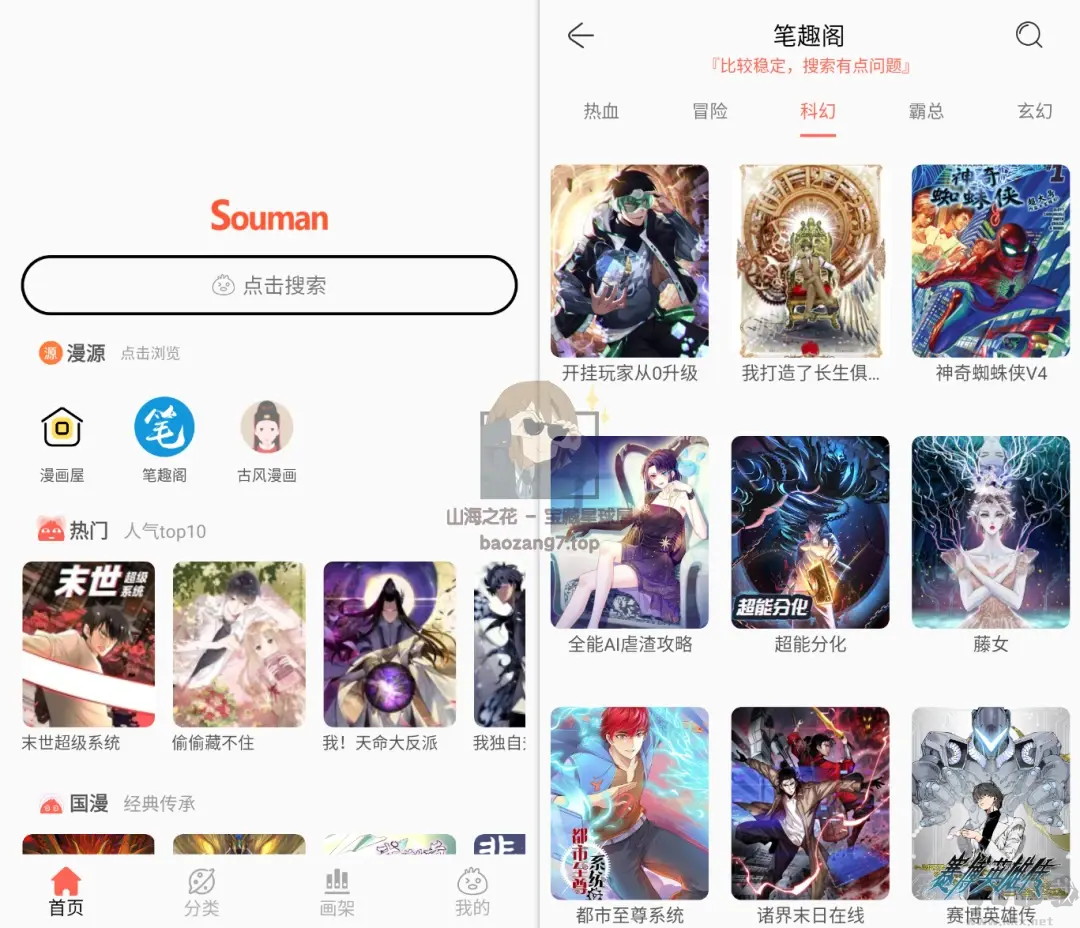 souman漫畫它聚合了漫畫屋、筆趣閣以及古風漫畫這三大漫畫資源網(wǎng)站的內(nèi)容,讓你輕松找到并閱讀心儀的漫畫作品。一打開APP,首頁就呈現(xiàn)出整潔的界面,推薦的漫畫都是近期熱門、備受好評的資源。無論你喜歡哪種題材,這款APP都能滿足你的需求。它擁有龐大的漫畫庫,涵蓋了上萬部國內(nèi)外漫畫作品,從奇幻、動作到歷史、武俠,再到格斗、日漫、韓漫等,種類豐富多樣。你可以根據(jù)自己的喜好,在詳細的分類中輕松找到想看的漫畫。而且,所有漫畫都支持隨點隨看,閱讀體驗非常流暢。