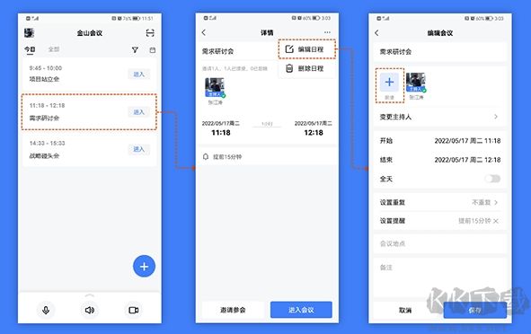 (1)接受會議日程,即可金山會議中看到該日程,點擊“進入”按鈕即可入會。