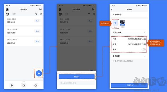 點擊“+”按鈕,再點擊“新會議”按鈕,即可創(chuàng)建會議。修改會議時間,即可預(yù)約會議。