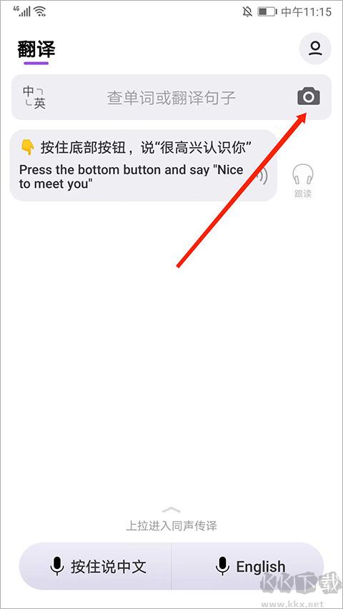 1、打開(kāi)騰訊翻譯君app,選擇右上方“相機(jī)”圖標(biāo),