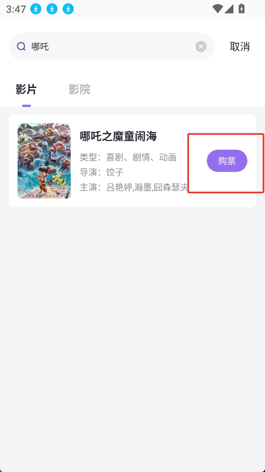 2.搜索完成后選中你想要觀看的影片,點(diǎn)擊右邊的“購(gòu)票”;