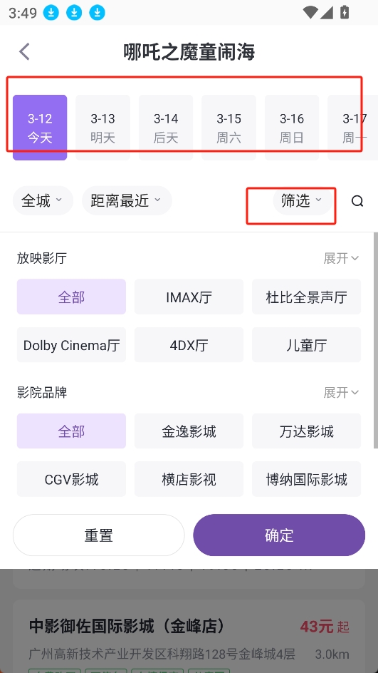 3.選好觀影時(shí)間,選擇好篩選條件后點(diǎn)擊確定;