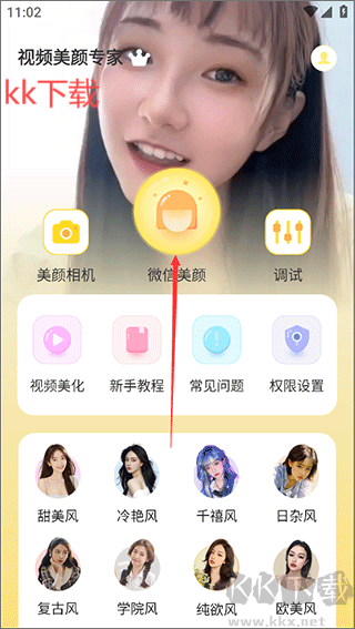 1、首先,請通過本站下載并安裝視頻美顏專家手機版。于軟件首頁尋找到 “微信美顏” 功能選項,點擊進入該功能模塊 ;