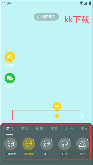 2、在當前頁面,我們能夠進行自拍操作,之后可在頁面下方對視頻美顏中的美顏效果予以調節(jié);