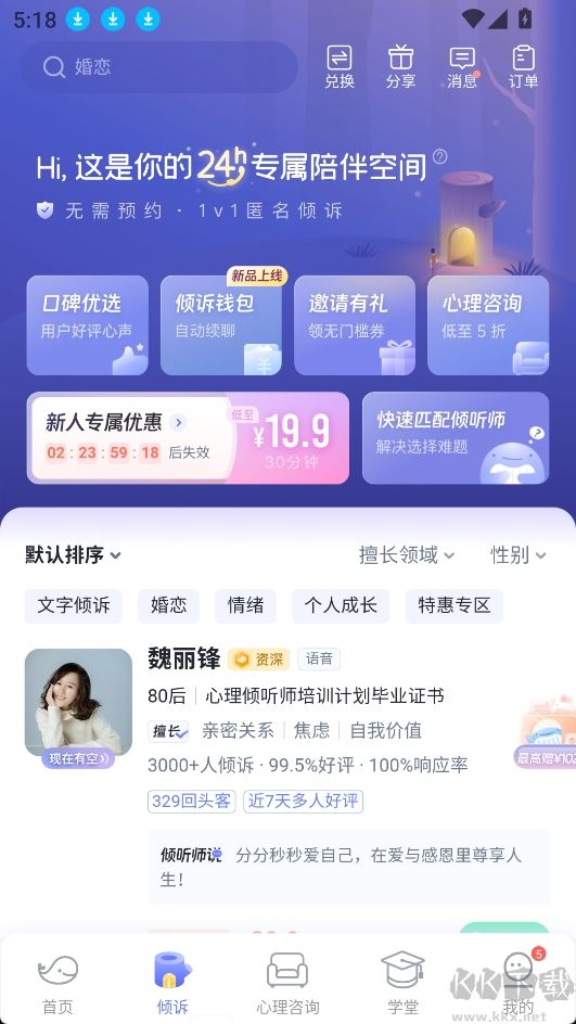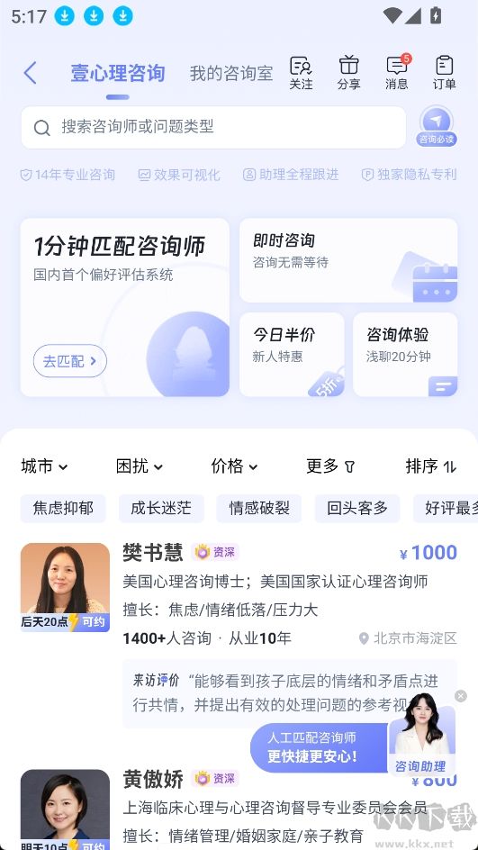 2.專(zhuān)業(yè)心理咨詢(xún)師,可以預(yù)約語(yǔ)音、視頻或面對(duì)面咨詢(xún),可以按城市、價(jià)格、咨詢(xún)方向等選擇咨詢(xún)師;