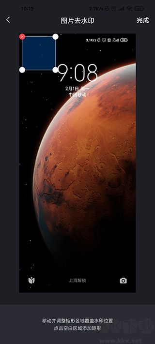 2.【圖片去水印】:僅需將圖片導(dǎo)入至應(yīng)用程序,框選需去除的水印區(qū)域,點(diǎn)擊完成即可實(shí)現(xiàn)水印消除。