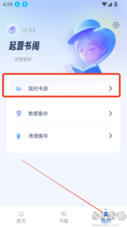 1.進(jìn)入app主頁,點(diǎn)擊我的,然后再點(diǎn)擊我的書源