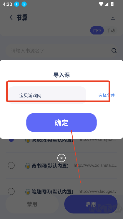 4.輸入書源地址,輸入導(dǎo)入書源地址,點(diǎn)擊確定即可。