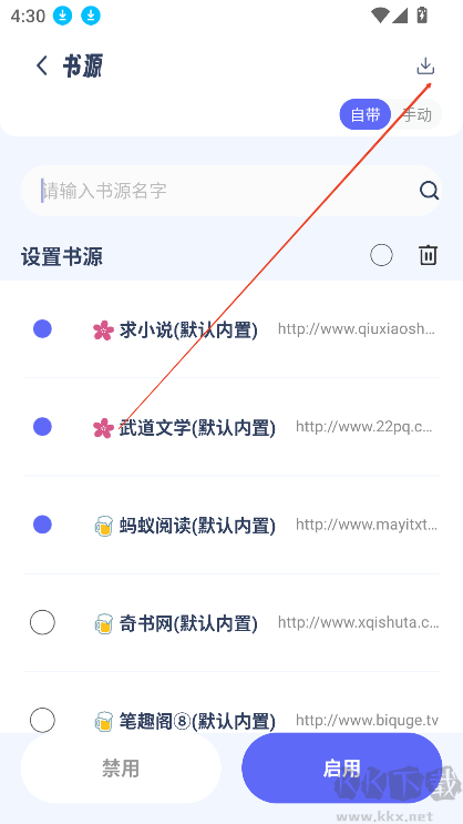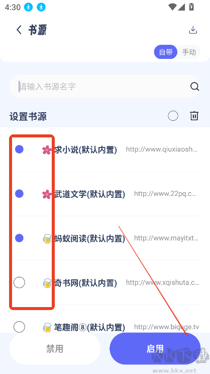 2.勾選想要導(dǎo)入的書源,點(diǎn)擊啟用即可;