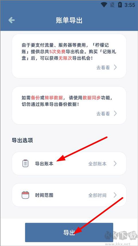 4、打開賬單導(dǎo)出頁面,導(dǎo)出選項(xiàng)包括導(dǎo)出賬本、時(shí)間范圍。點(diǎn)擊 “導(dǎo)出賬本”,選擇默認(rèn)賬本或已添加的賬本,選擇完成后點(diǎn)擊下方 “導(dǎo)出” 按鈕,即可下載記錄數(shù)據(jù)。