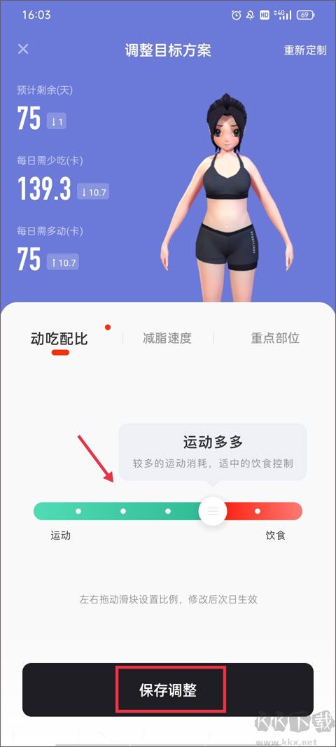 3、通過(guò)手指滑動(dòng)中間的滑桿,對(duì)您每日的飲食記錄進(jìn)行調(diào)整。調(diào)整完成后,點(diǎn)擊下方的 “保存調(diào)整” 按鈕即可。