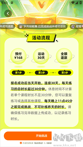 2、免費(fèi)參與流程:需先預(yù)付 168 元,按活動要求連續(xù)運(yùn)動 30 天,達(dá)標(biāo)后可獲得全額退款,實(shí)現(xiàn)免費(fèi)使用。