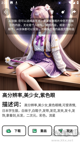2、精準(zhǔn)輸入描述:在修飾詞框內(nèi)輸入詳細(xì)畫作描述,如 “高分辨率、美少女、紫色眼睛” 等具體元素 。