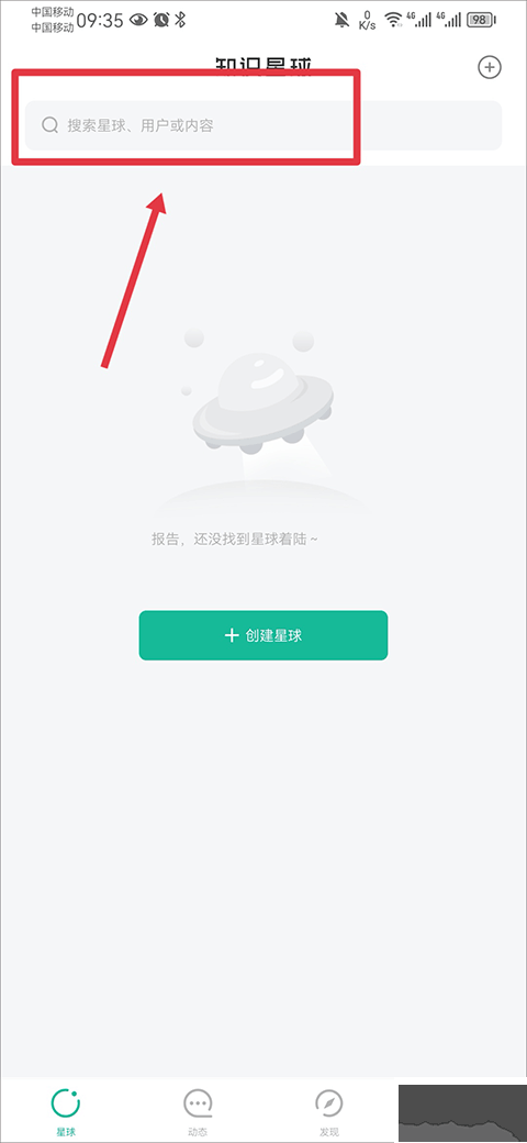 1、打開app,在首頁(yè)中的搜索框中搜索別人的星球名稱、用戶或內(nèi)容
