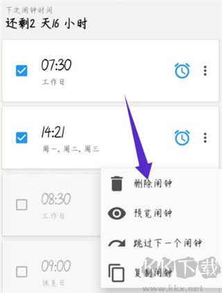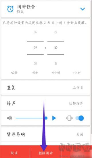 2、在顯示的選項中,點擊刪除鬧鐘,便可直接刪除該鬧鐘設置,完成關閉。