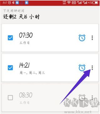 1、打開在本站下載的使命鬧鐘 alarmy,在鬧鐘主界面,點擊鬧鐘后面的三點圖標,進入操作選項。