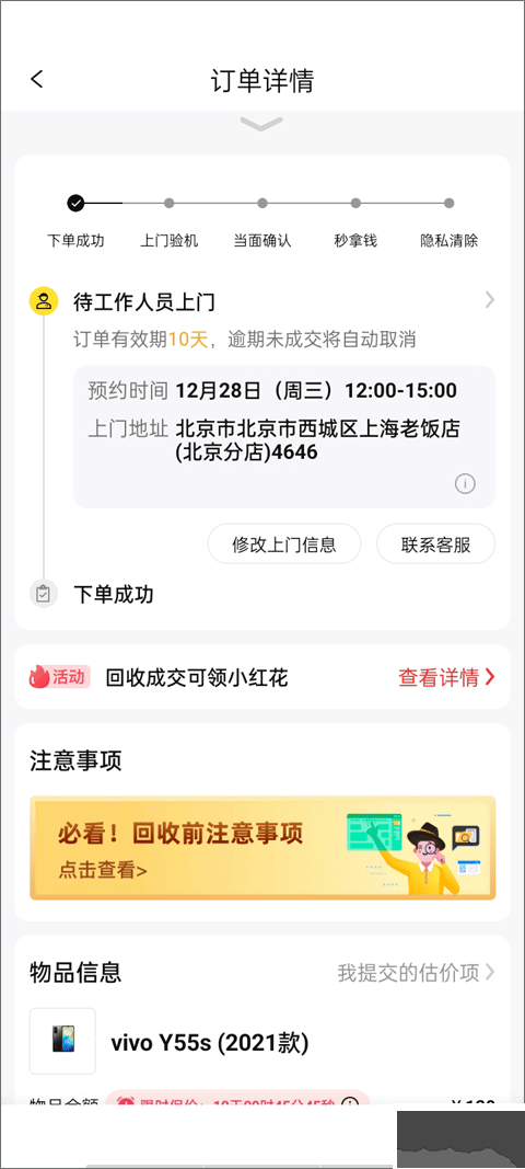 8、填完所有信息,下單成功,靜候工作人員上門。若不想回收,在工作人員上門前取消訂單即可。