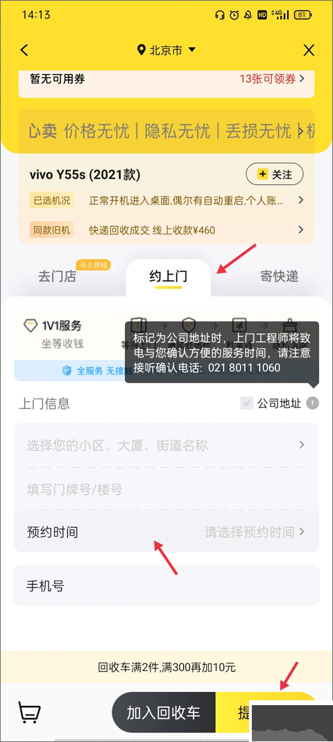 6、開啟上門回收服務(wù),有去門店、約上門、寄快遞三種方式,點擊約上門,填上門信息和預(yù)約時間,再點 “提交訂單”。