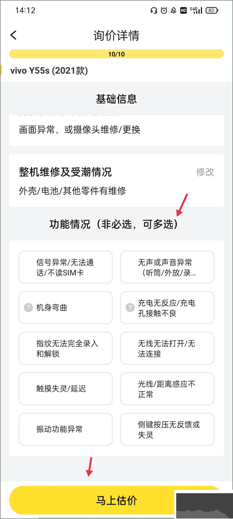 5、回答完所有相關(guān)問題,明確手機(jī)基本信息、維修受潮及功能情況,即可 “馬上估價”。
