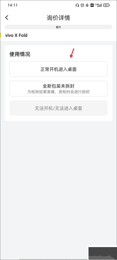 4、進(jìn)入手機(jī)估價階段,依據(jù)手機(jī)狀況,選擇使用情況,暫不支持 “無法開機(jī) / 無法進(jìn)入桌面” 手機(jī)。