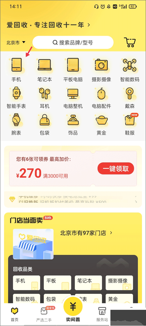 1、用本機(jī)手機(jī)號登錄愛回收賬號,進(jìn)入【首頁】,可見手機(jī)、筆記本等回收類型,點擊 “手機(jī)”。