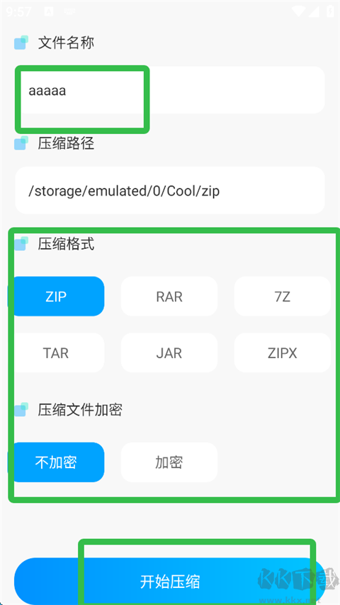 5、輸入文件名稱,選擇壓縮格式和加密方式,點(diǎn)擊 “開始壓縮” 即可完成。