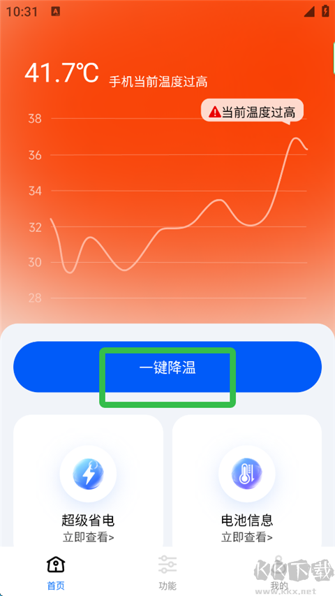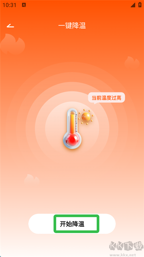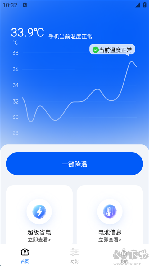 1、打開(kāi)手機(jī)降溫散熱器 app,查看當(dāng)前手機(jī)溫度,點(diǎn)擊 “一鍵降溫” 按鈕。