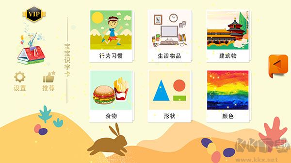 7、【海量資源】包含256張識字卡,12大類主題:自然景觀、ABC字母、動物世界、新鮮蔬菜、美味水果、交通工具、好習(xí)慣養(yǎng)成、日常用品、特色建筑、美食天地、形狀認(rèn)知、色彩王國,57種動物音效,26首字母兒歌,每張卡片均配有圖像、拼音、漢字、中英文對照及發(fā)音。