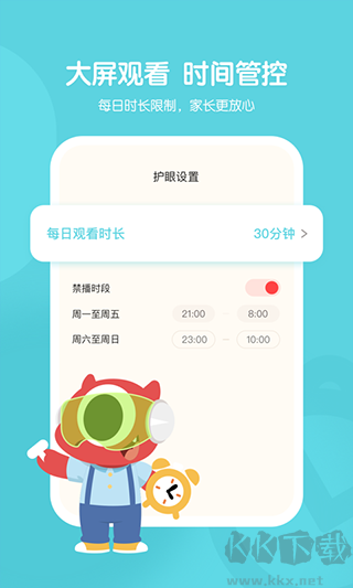 家長可以自由設(shè)置每天的觀看時間和休息時段,時間一到自動切換成音頻模式,保護(hù)孩子的小眼睛。
